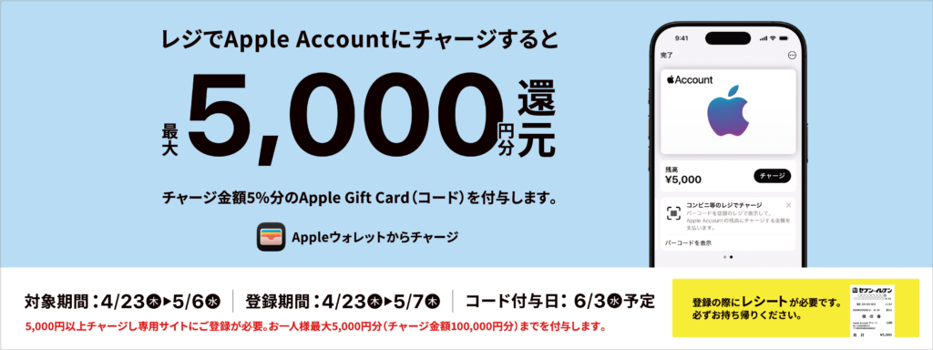 コンビニで「Apple Accountにチャージ」が最大5%バック中。これ経由でAppleStoreでiPhoneやMac、AppleWatchが実質5%OFFで購入可能へ。4/23~5/7。