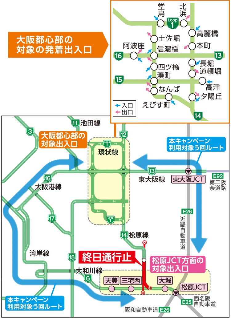 松原線の喜連瓜破~三宅JCTが終日通行止めとなりますが、今なら下記区間の対象出口で