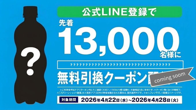 ローソンストア100で先着13,000名に無料ドリンクを配布予定。ファンタかな?⇒ファンタでした。4/22~4/28。