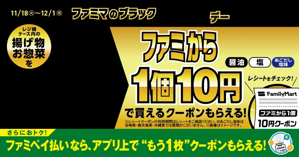 【予告】ファミマのブラックフライデーで、レジ横お惣菜2個購入ごとに「ファミから」10円クーポンがもらえる。11/18~12/1。