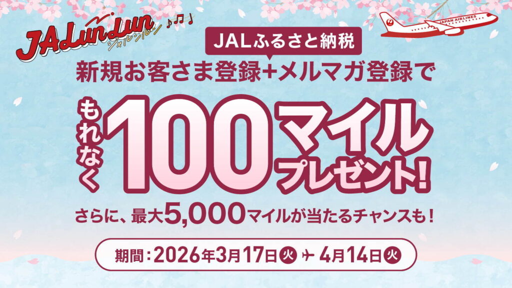 JALふるさと納税で新規登録で納税しなくても100マイルがもれなく貰える。さらに500~5,000マイルが抽選で350名に当たる。3/17~4/14。