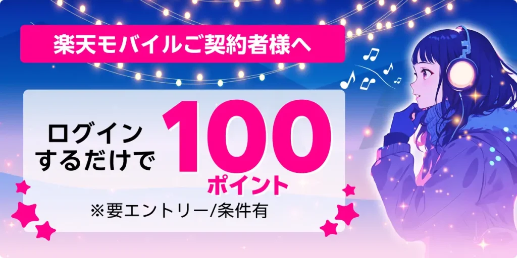 楽天モバイル契約者が楽天ミュージックにログインするだけで100ポイントが貰える。~12/26 10時。