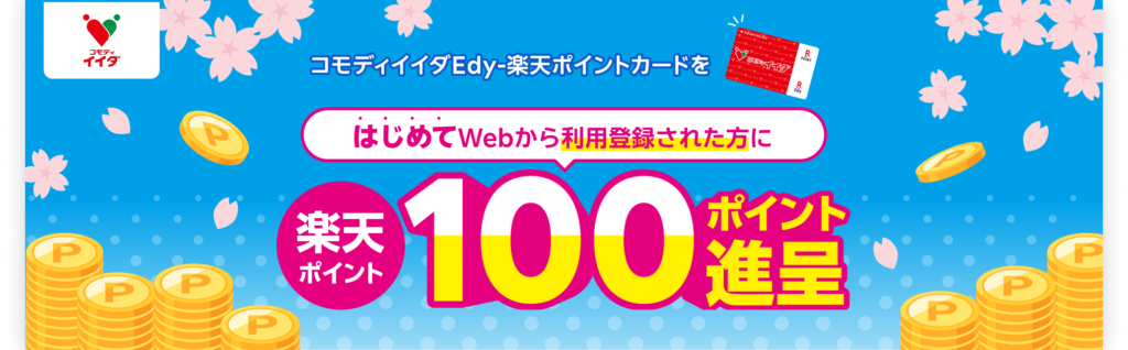 コモディイイダEdy-楽天ポイントカードをはじめてWeb登録すると、もれなく楽天ポイント100ポイントがもらえる。~4/1。