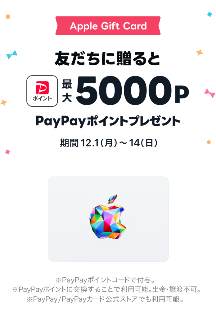 Apple Gift Cardを友だちに贈ると、購入額に応じて最大5,000Pが貰える。~12/14。