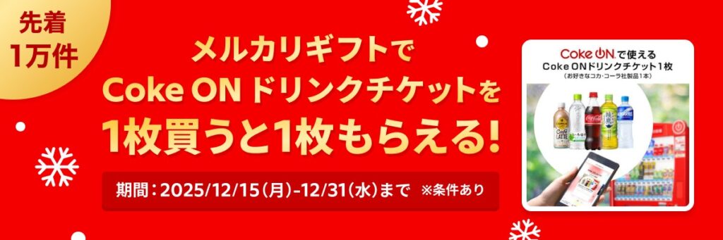 メルカリギフトで先着1万名限定、コカ・コーラのCokeONドリンクチケットを1枚買うと1枚貰える。~12/31。