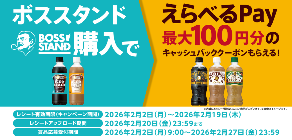 サントリーボススタンドを買うと、えらべるPay100円分がもらえる。~2/19。