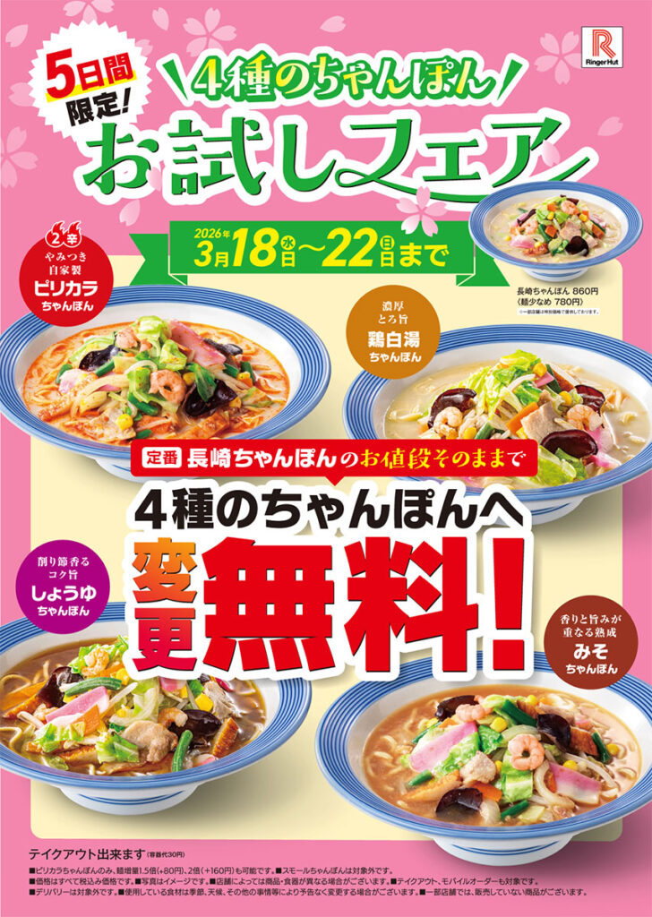 リンガーハットでお値段据え置き4種のちゃんぽんお試しフェアを開催中。3/18~3/22.