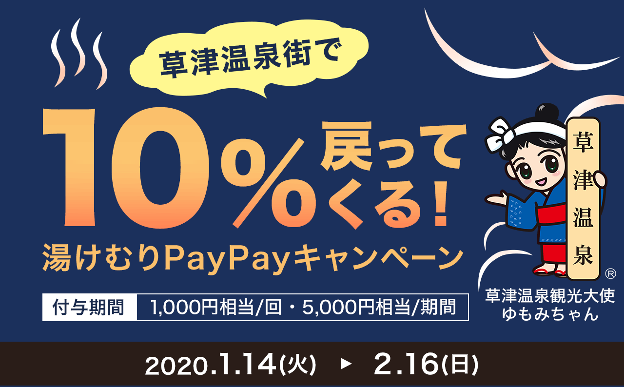 PayPayで草津温泉街で10%戻ってくる湯けむりPayPayキャンペーン。1/14~2/16。