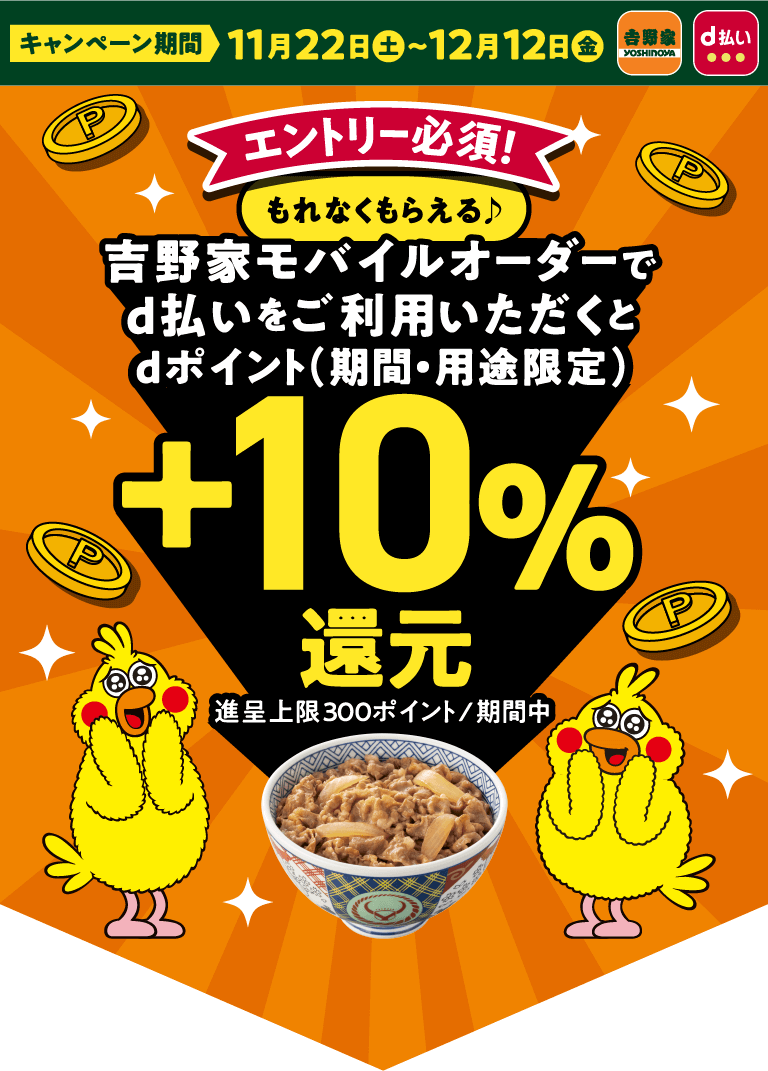 d払いモバイルオーダーで吉野家で支払うと+10%還元中。~12/12。