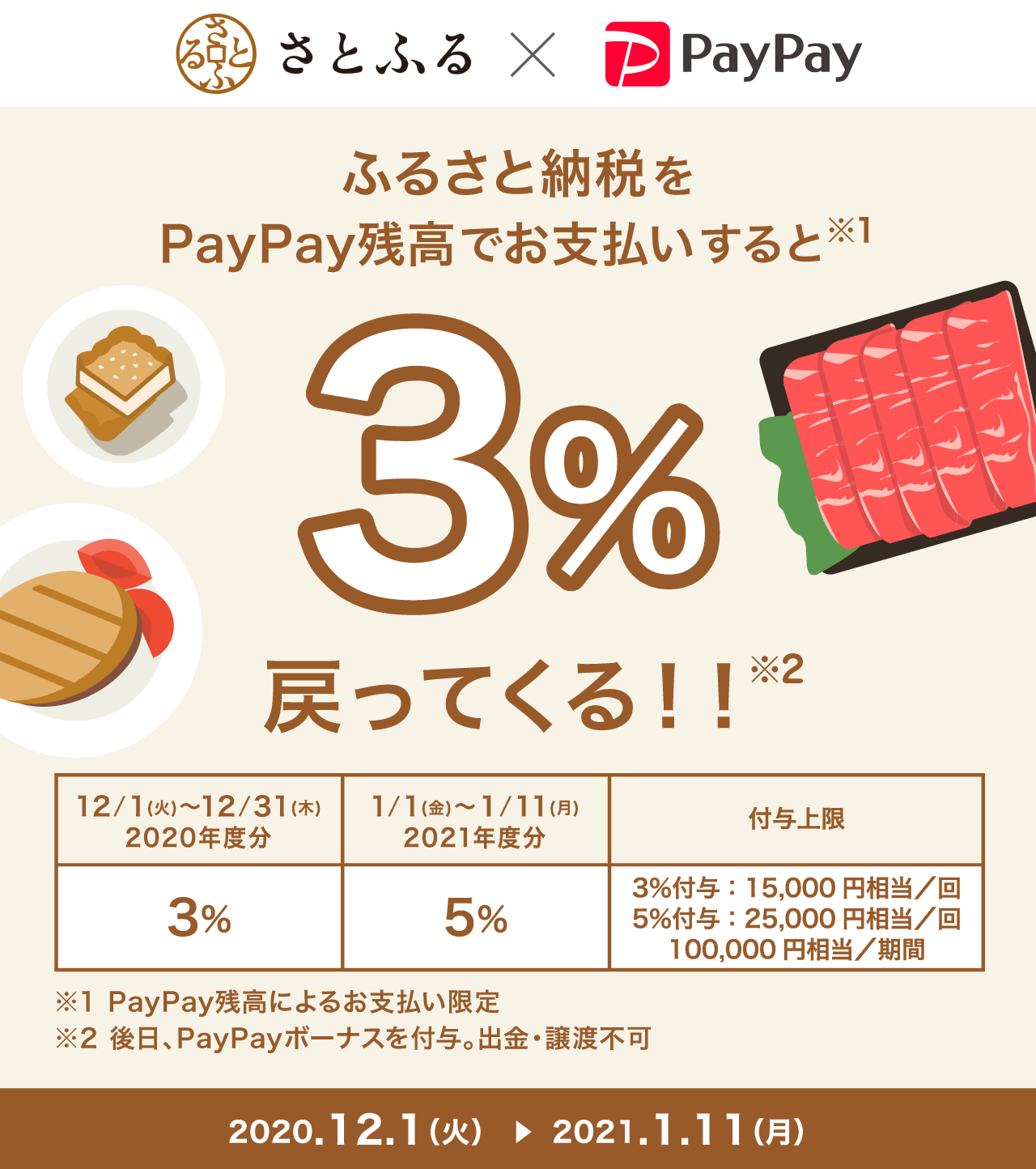 ❸PayPay主催 :「さとふるでのPayPay残高払いで3%還元」で寄付額の3%PayPayボーナス還元