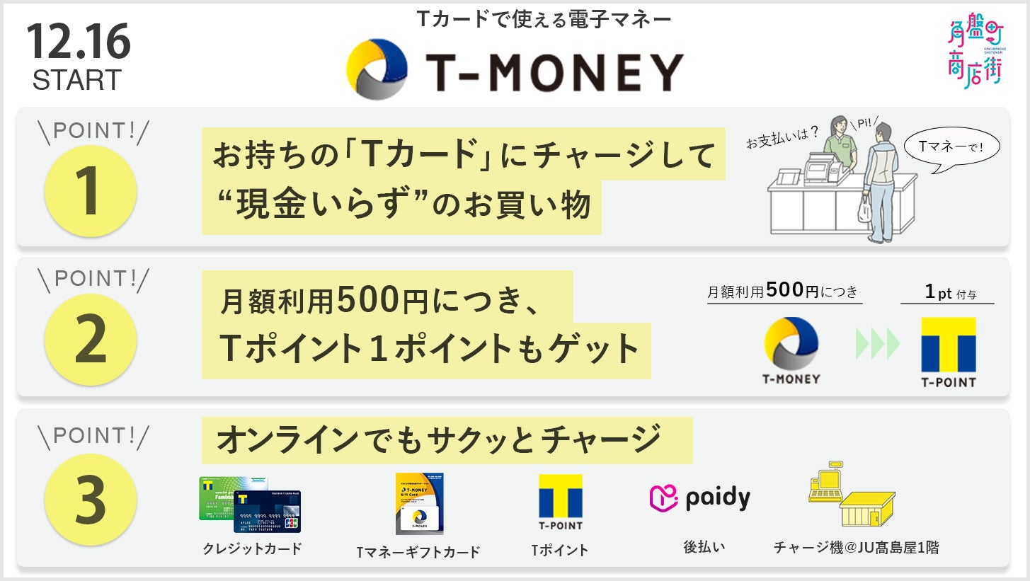【「Tカード/モバイルTカード」にチャージして「キャッシュレス決済」】12月16日から、鳥取県・米子市の角盤町商店街で電子マネー「Tマネー」が使える!|CCCMKホールディングス株式会社のプレスリリース