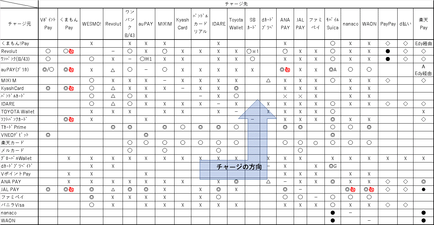 nanaco/WAON→Revolut、auPAY、MIXIM、TOYOTA wallet、dカードプリペイド、ANAPay、JALPay、FamiPay、楽天Edyは、「×」