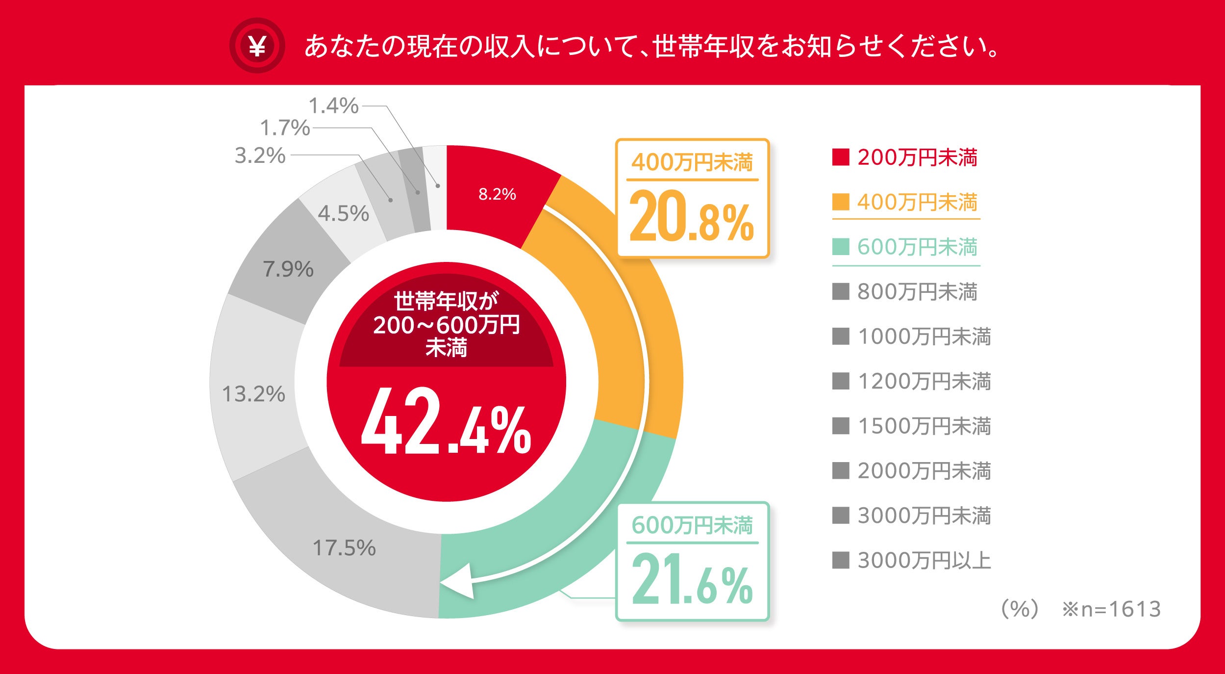 ・個人年収を聞いた質問では、1位が「200万円未満(39.6%)」、次いで「200万円~400万円未満(23.2%)」、「400万円~600万円未満(17.2%)」に。さらにゴールドカード保有者で個人年収が「400万円未満」の人のなかには、専業主婦(主夫)や学生なども多く含まれており、誰でもゴールドカードを持つ時代になったと言えます。一方、世帯年収では、「200万~600万円未満」が42.4%を占め、メインボリュームとなっております。
