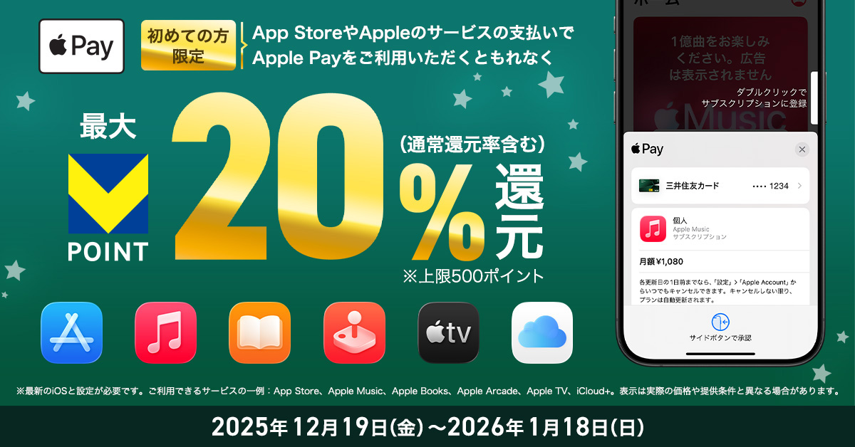 三井住友カードでApp StoreやAppleのサービスの支払いにApple Payを初めて利用で20%還元キャンペーン。上限500ポイント。~2026/1/18。
