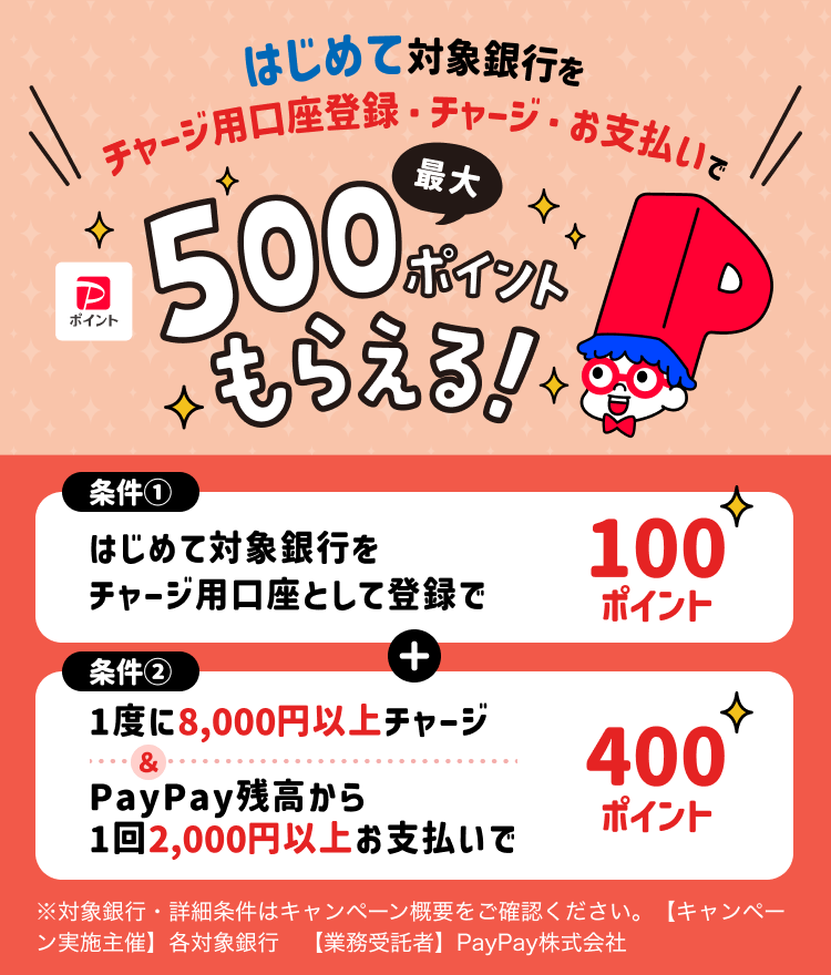 - 条件②: 登録した口座から1度に8,000円以上をチャージし、さらにPayPay残高から2,000円以上を支払い → 400ポイント