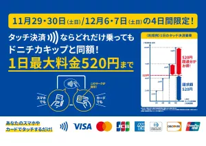 札幌市営地下鉄でタッチ決済乗車すると、1日の運賃が自動上限520円に割引へ。11/29~11/30、12/6~12/7。