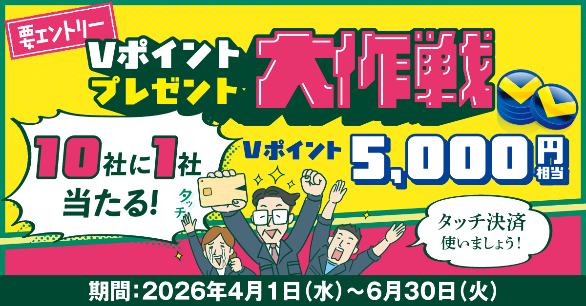 対象カードの利用額が合計5万円以上になると、抽選で10社に1社へVポイント5,000円相当が当たります。