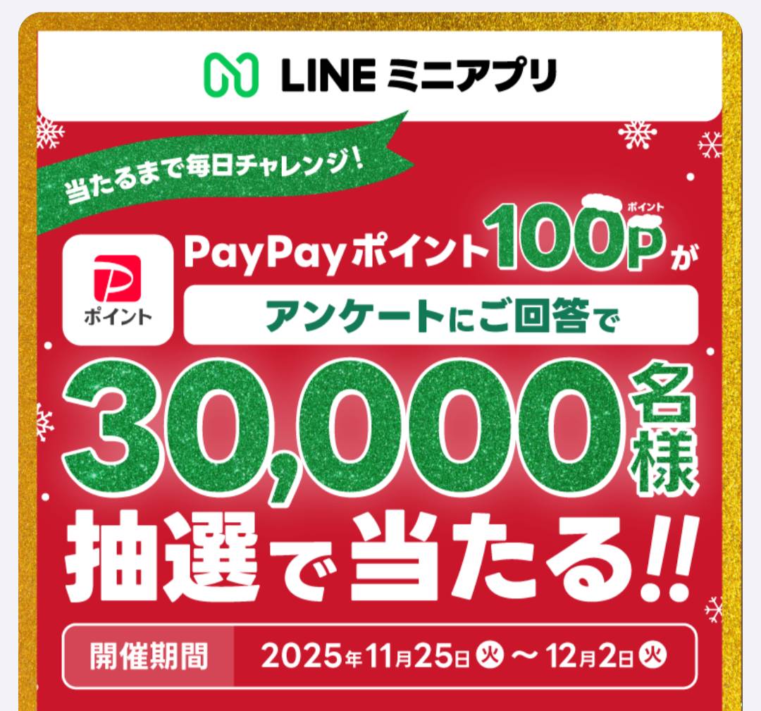 LINEミニアプリで抽選で3万名に100PayPayポイントが当たる。~12/2。
