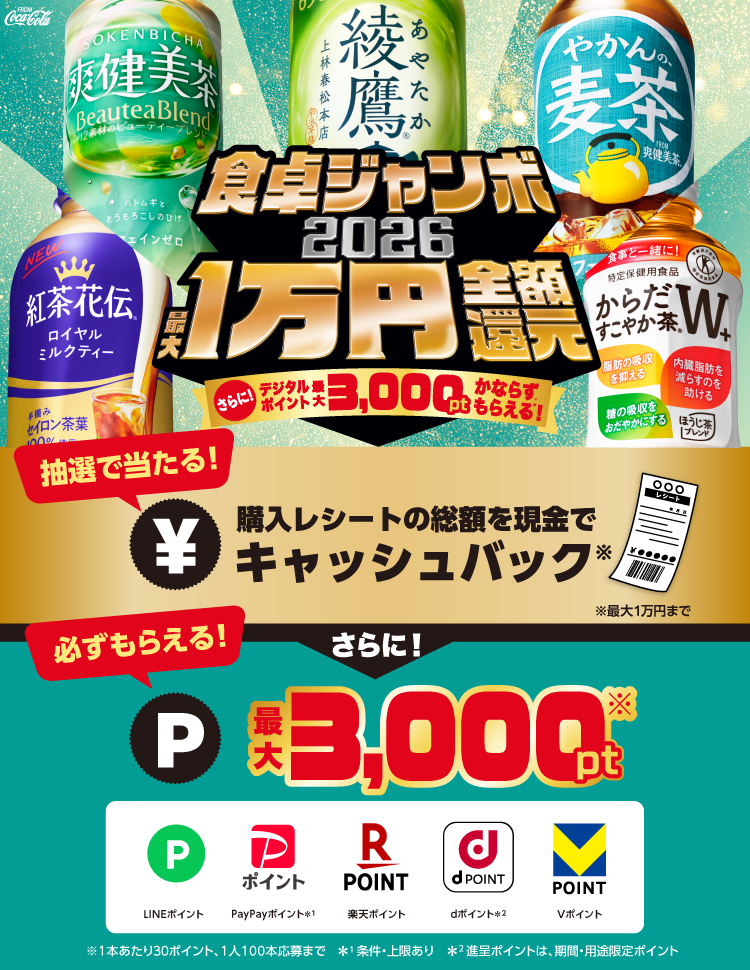 コカ・コーラの綾鷹や爽健美茶を買うと1本30円相当のデジタルポイントが貰える。抽選で最大10000円分が当たる。1/19~3/15。