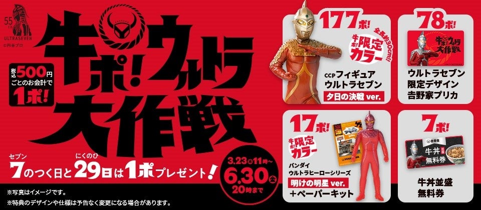 吉野家で牛ポアプリで500円以上決済すると、5回でウルトラマン1話無料、7回で牛丼1杯無料、177回でフィギュアなどが貰える。~6/30 20時。
