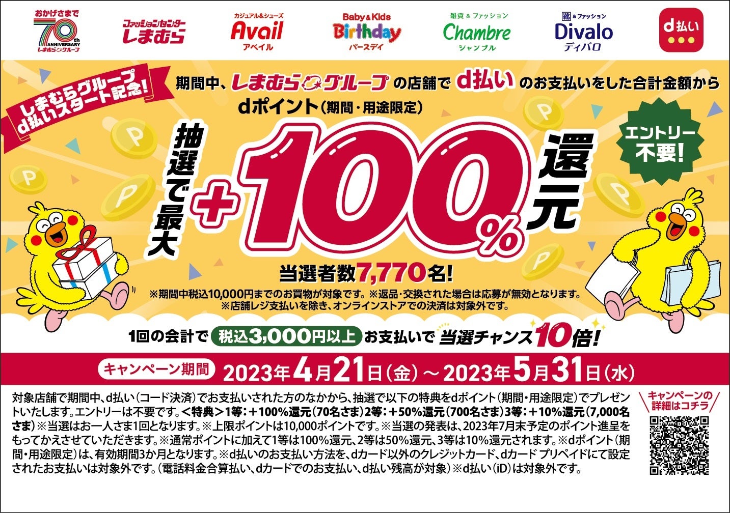 しまむらでd払いが利用可能に。4/21よりd払いで10-100%還元が当たる。4/21~5/31。
