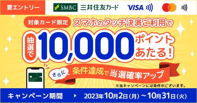 三井住友カードでタッチ決済を使うと抽選で1,000名に10,000円相当のVポイントが当たる。すぐに使うと10倍当たる。~10/31。