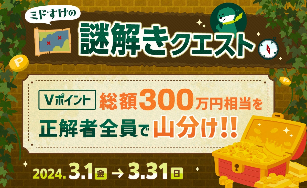 三井住友銀行アプリで謎解きクエストでVポイント総額300万円相当を正解者全員で山分けへ。~3/31。