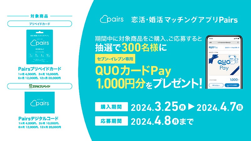 セブンイレブンでPairsプリペイドが登場へ。これでお前らも出逢えるな。300名にQUOカードPayが当たる。~4/7。