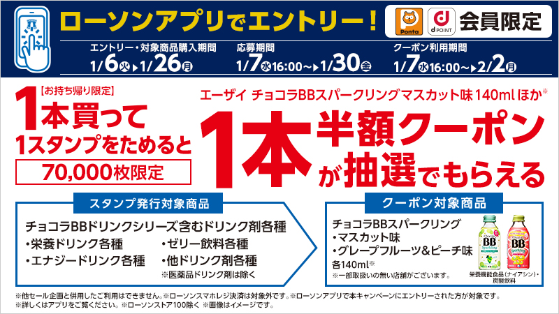 ローソンでアプリからエントリーして、ポイントカードを提示して対象商品を買うとスタンプが貰え、