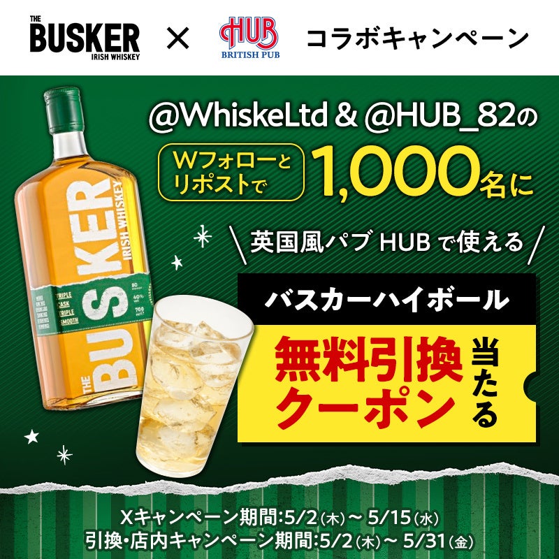 英国風パブ 「HUB」で「バスカー アイリッシュウイスキー ハイボール」が抽選で1000名に当たる。店舗では買うとオリジナルグッズが当たる。5/2 12時~5/15。