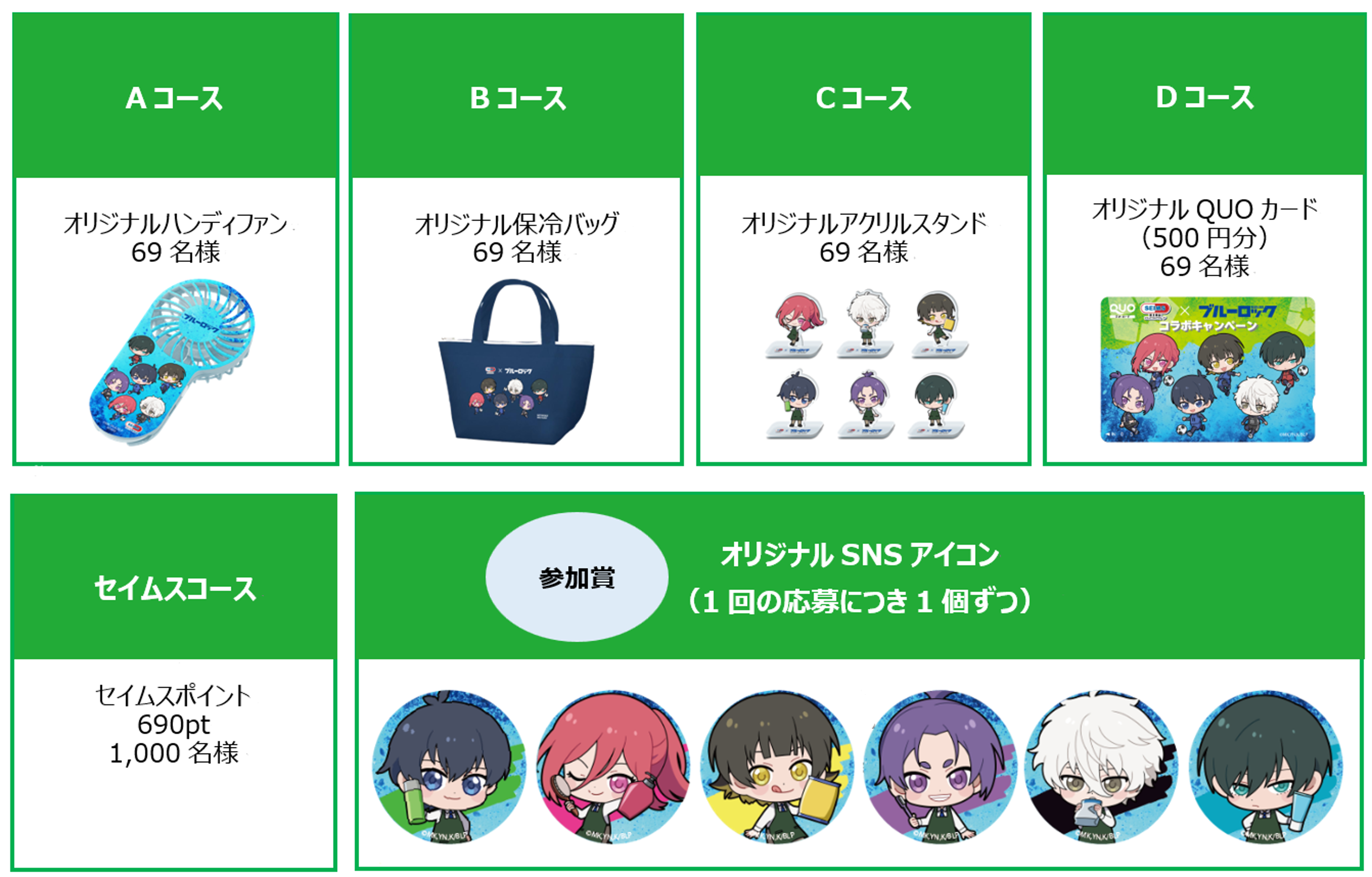 アニメ『ブルーロック』とセイムスがコラボし、購入金額に応じて下記商品が当たります。