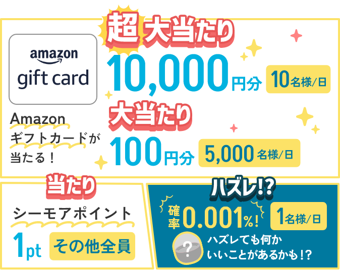 ・大当たり:Amazonギフトカード 100円分(5,000名様/日)