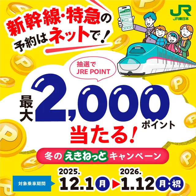 えきねっとで新幹線・特急券を購入ると、抽選で最大2,000ポイントが当たる。~1/12。