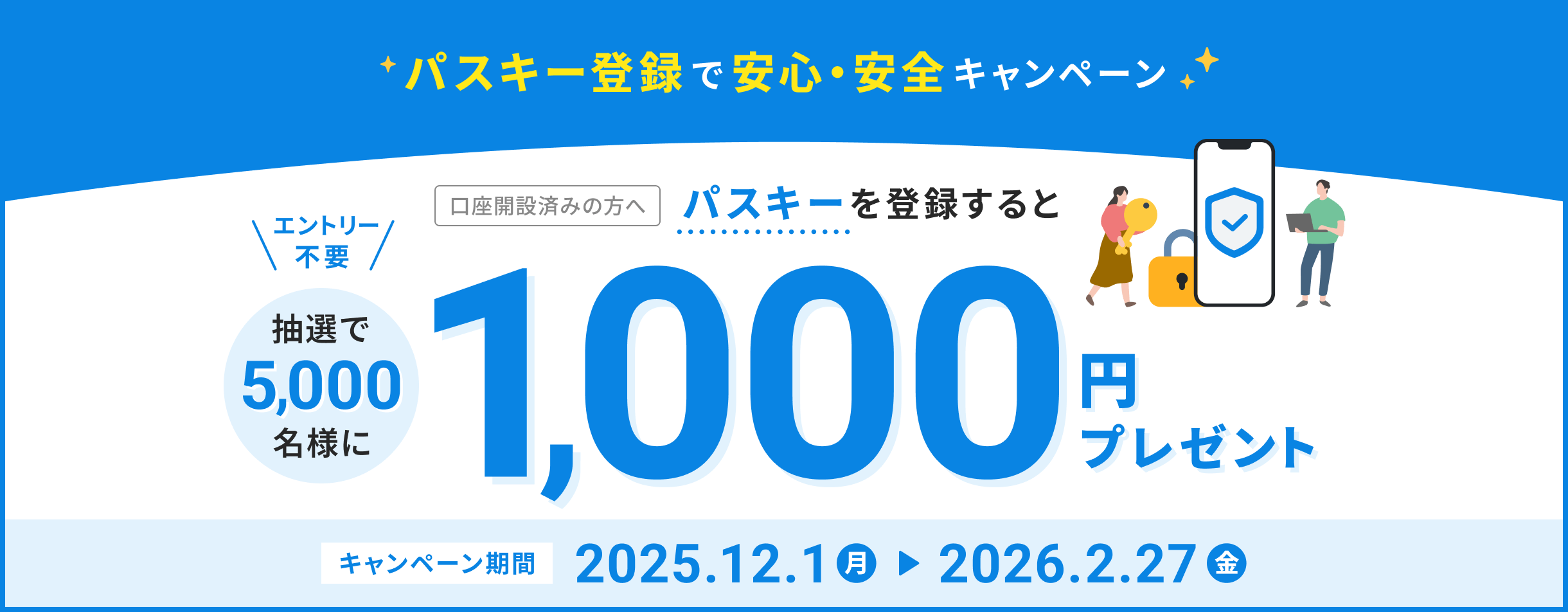 ウェルスナビでパスキーを登録すると、抽選で5,000名に1,000円が当たる。~2/27。