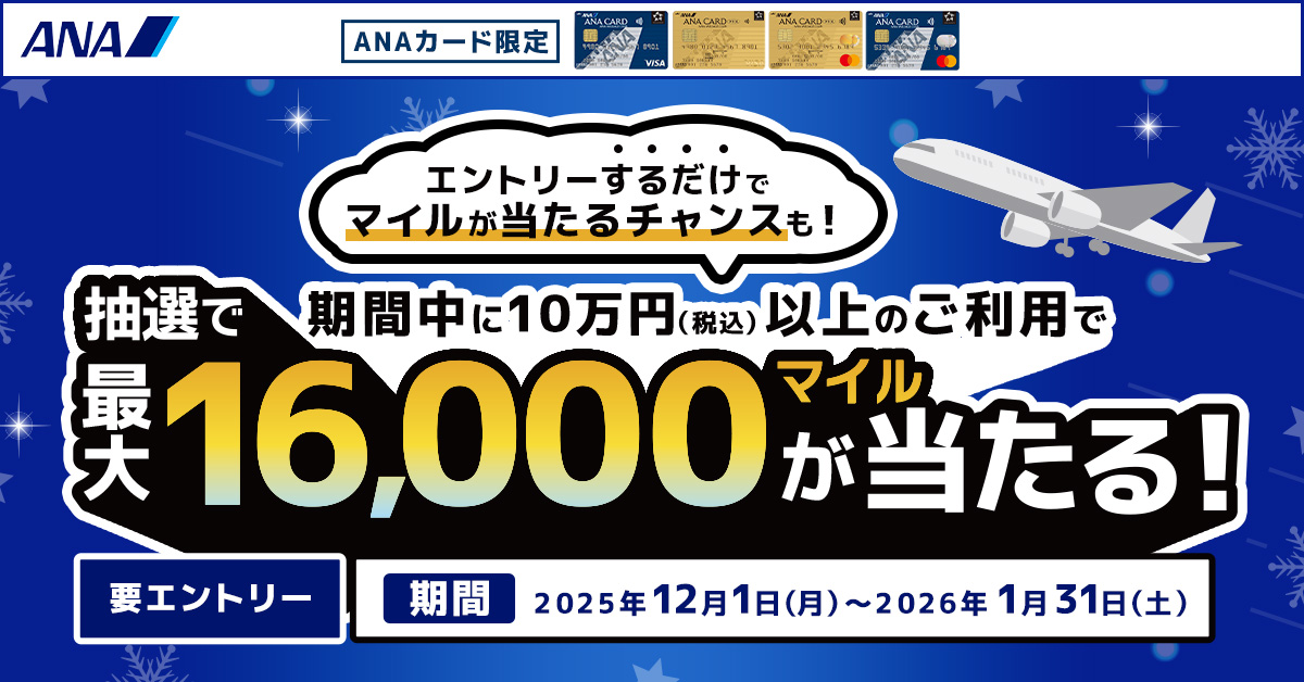 ANAカードで抽選で3000名に100マイル、10万円以上利用で抽選で最大16,000マイルが20,000名に当たる。~1/31。