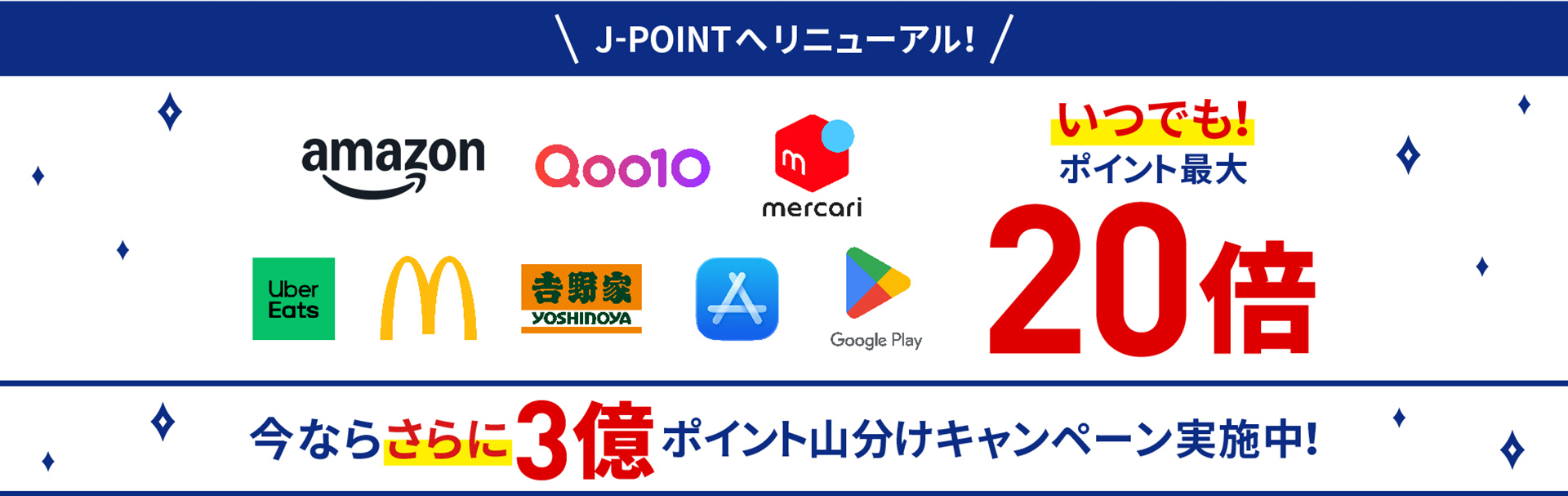 どこでもいいので10万円以上の決済を行うと、J-POINT3億ポイントの山分け対象になります。
