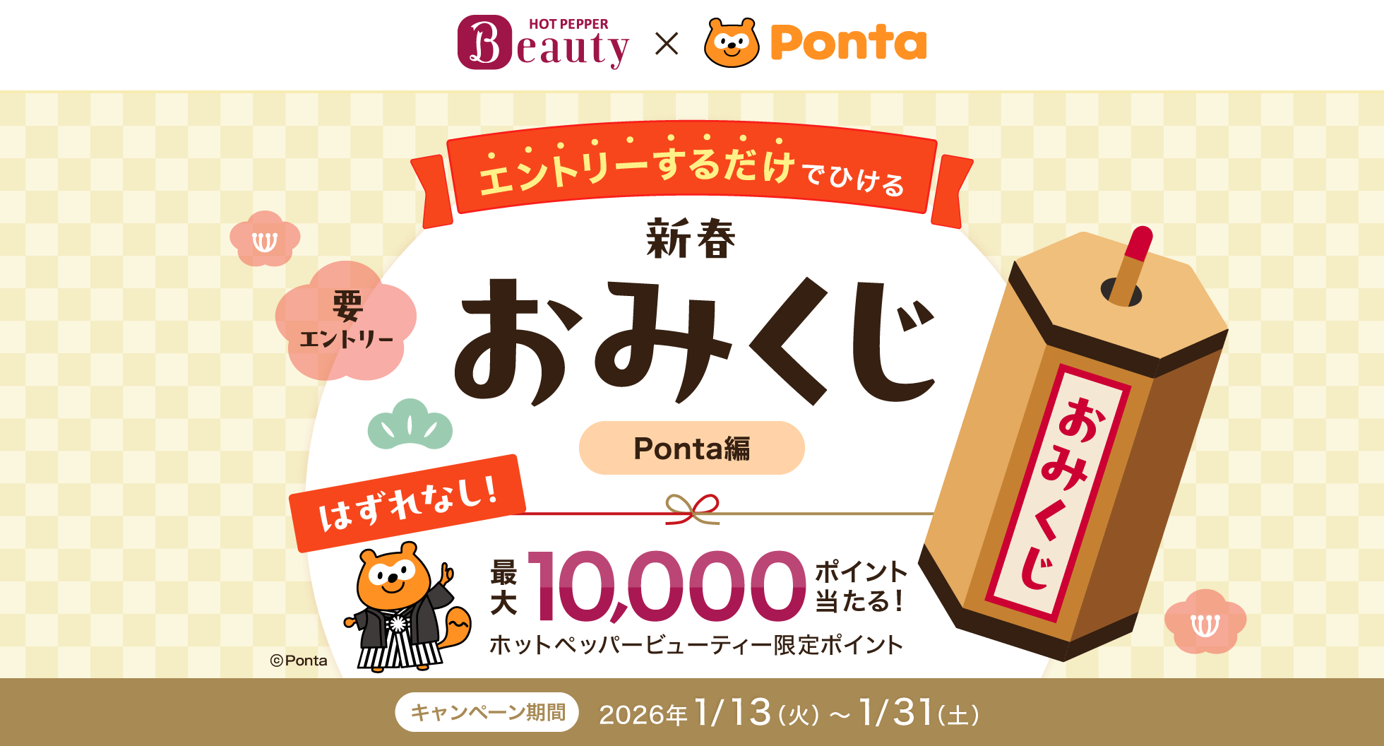 ホットペッパービューティー限定ポイントが抽選で最大10,000ポイント当たる。無い髪が切れそう。~1/31。