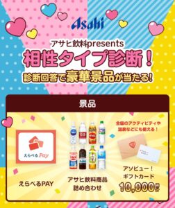 アサヒ飲料LINEでえらべるPayが9690名、アサヒ飲料商品詰め合わせが300名に当たる。~3/13。