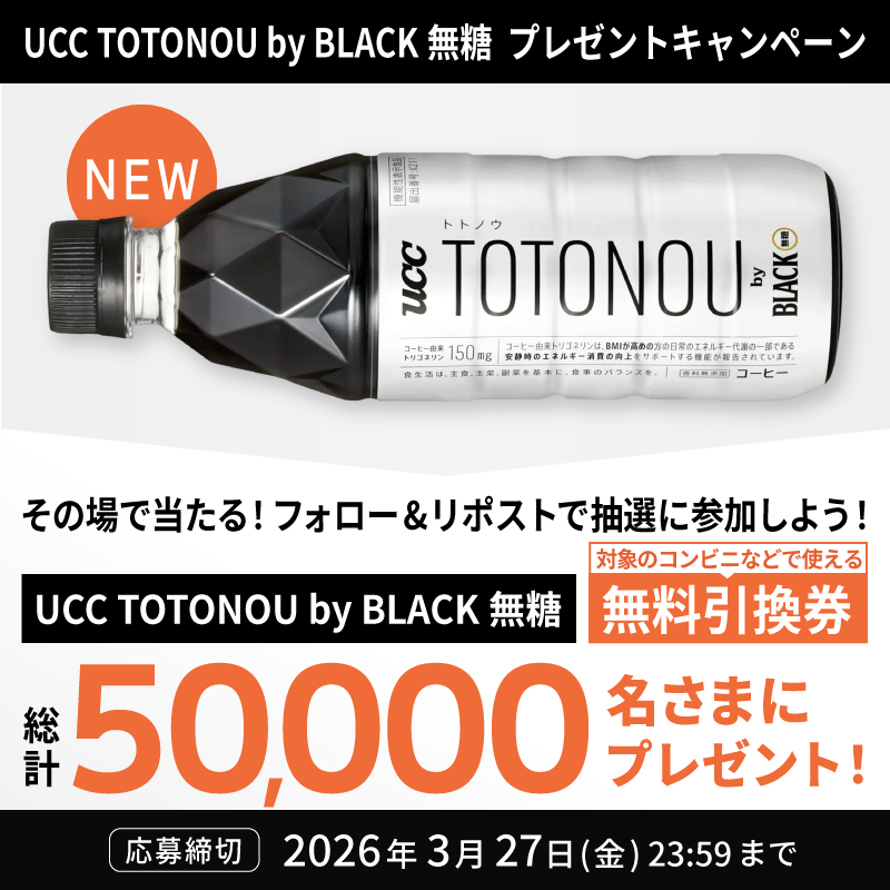 UCC TOTONOU by BLACK無糖が抽選で5万名にその場で当たる。コンビニとスギ薬局で引き換え可能。~3/27。