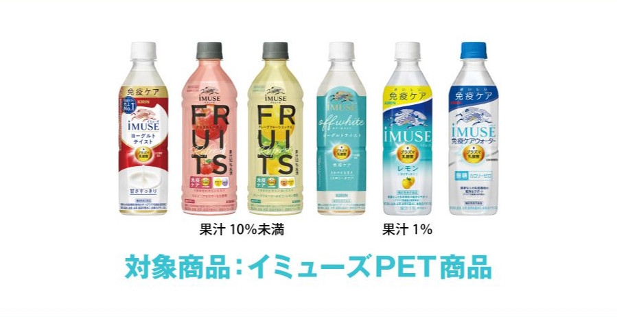 キリン イミューズ フルーツリフレッシュ グレープフルーツミックス 500ml・アップルミックス 500ml、キリン イミューズ ヨーグルトテイスト 500ml、キリン イミューズ オフ・ホワイト ヨーグルトテイスト 500ml、キリン イミューズ レモン 500ml、キリン イミューズ 免疫ケアウォーター 500ml(各6本パック・ケース含む)