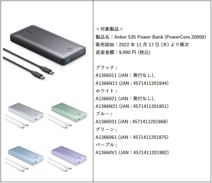 2023年1月、Ankerグループ本社より国外で本製品が発火する事象が数件※発生した旨の報告が届き、Ankerグループのグローバル全体で販売を停止。報告時には既に原因究明に向けて調査を開始しており、設計上ならびに製造過程の不備が見つかったため、Ankerグループのグローバル全体での自主回収を決定致しました。