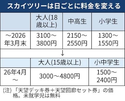 これまでは平日と休日、前売り券と当日券で大人料金で2100円から2600円までの価格差を設けていたが、これらの種別を廃止し、今後は日ごとに料金を設定する。購入日や入場時間帯では価格差をつけない。小学生と中高生で差をつけていた料金も変え、15歳以上は大人料金にする。天望デッキと高さ450メートルの「天望回廊」のセット券は大人3000〜4800円とする。従来は最安料金が平日前売り券の3100円、最高が休日の当日券の3800円。より安く入れる日ができる一方、混雑が予想される日は実質的な値上げになる。