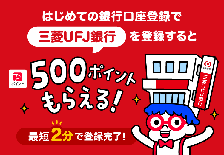 PayPayで初めて銀行口座登録&三菱UFJ銀行登録で500ポイントが貰える。2/1~2/28。