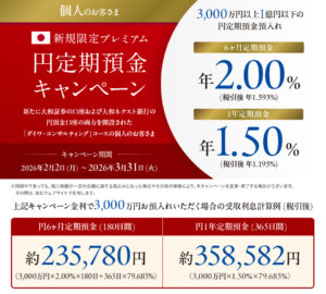 キャンペーン期間中、スーパー定期3カ月へ新規資金で1契約500万円預け入れで、