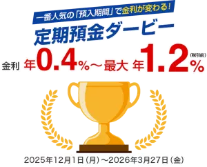 【予告】きらやか銀行で一番人気の預金機関で金利0.4%~最大1.2%となる定期預金ダービーを開催。12/1~2026/3/27。