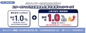スタートアップ円定期預金(3ヵ月)への預け入れると、通常金利年1.0%(税引前)に加え、