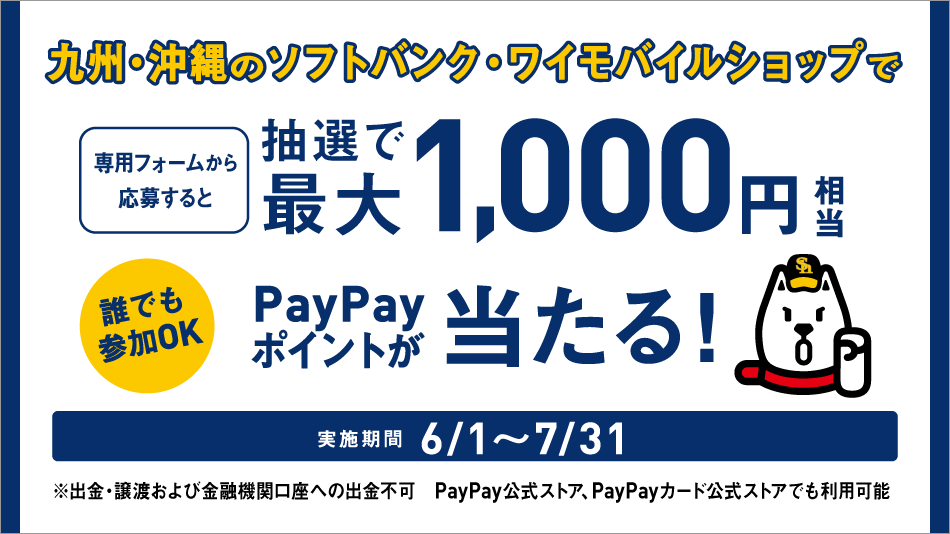 九州・沖縄のソフトバンク・ワイモバイルショップに行くと何も買わなくても200PayPayがもれなく、抽選で最大1000円相当PayPayが当たる。6/1~7/31。