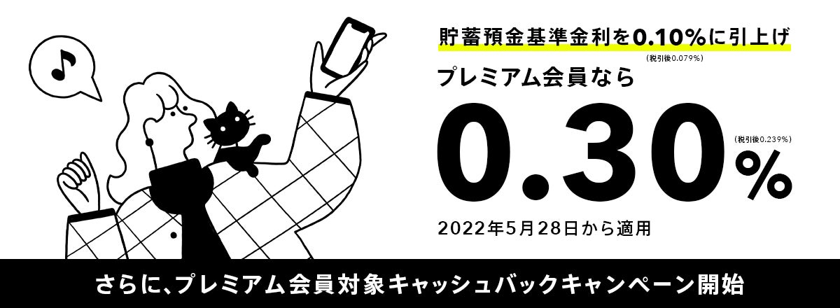 みんなの銀行で普通預金金利が0.1%、プレミアム会員ならば0.3%へ。1000万円で税引き後2.4万円/年。5/28~。