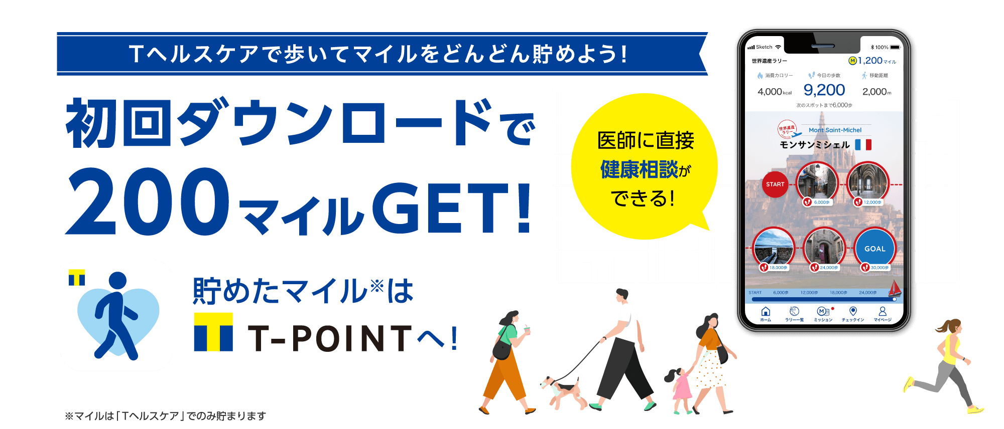 歩数に応じてマイルが貯まるTヘルスケアですが、初回ダウンロードで200マイルが貰えます。