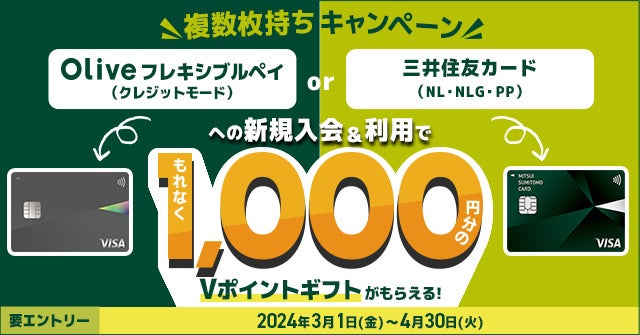 三井住友のOliveフレキシブルペイまたは三井住友カードを申し込み&利用でもれなく1000Vポイントが貰える。~4/30。